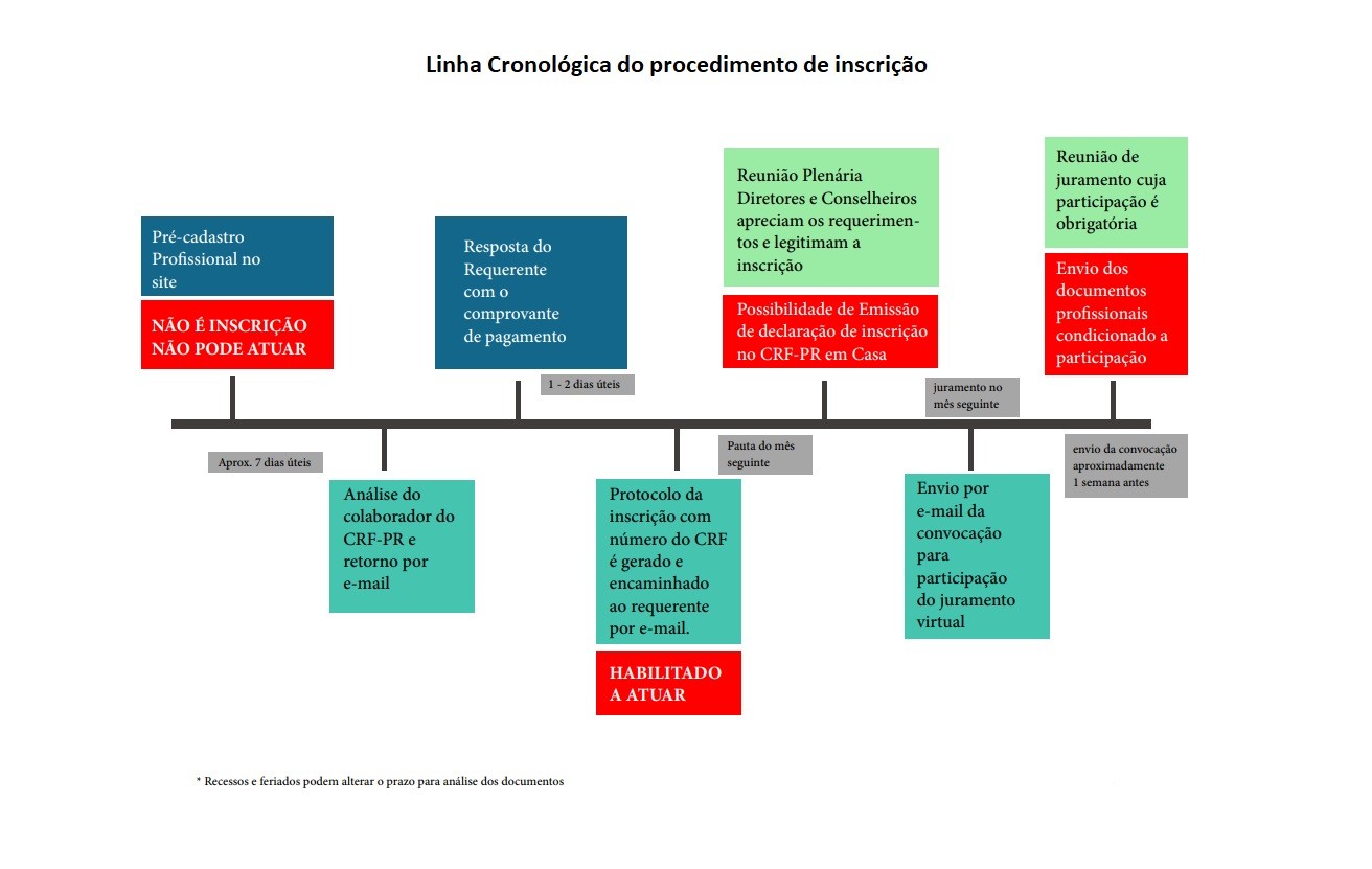 Prazo: O procedimento de inscrição é apreciado pelo Plenário do CRF-PR. O processo leva até 50 dias, podendo o prazo ser estendido em virtude da necessidade de diligências, como consulta a outros Conselhos Regionais caso o profissional tenha possuído registro anterior em outra jurisdição/CRF, além da consulta a Instituição de Ensino onde cursou a graduação para confirmação do egresso.